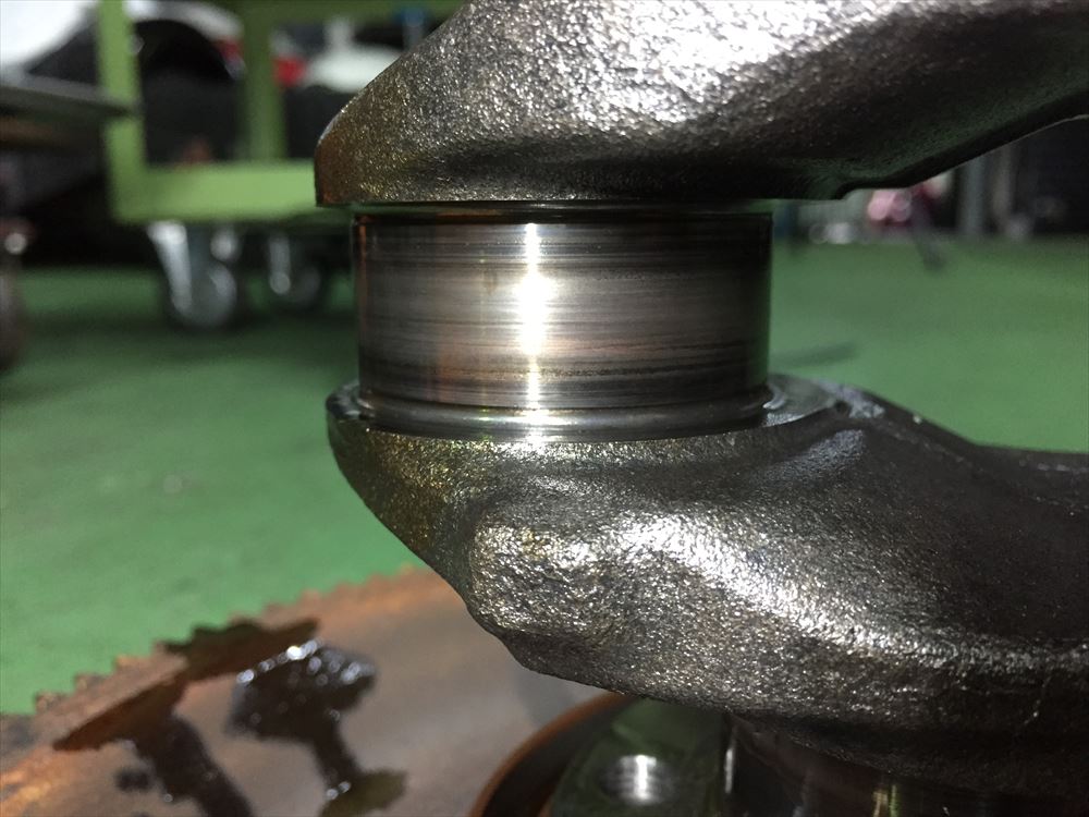 前回焼き付いてしまっていたクランクシャフトのコンロッドメタル側です。ジャーナル部はラッピング加工で対応も可能でしたが、クランクにはこの他にもオイルポンプ破損の際のダメージなどもあったため、新品に交換させていただきました。