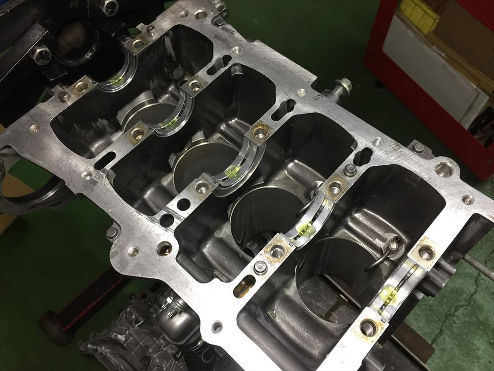 クランクシャフトを組み付け、プラスチゲージにてクリアランスの測定をしていきます。メタルにはサイズが数種類用意されているので、クリアランスの測定値に応じてサイズを変更し、最適値に合わせていきます。