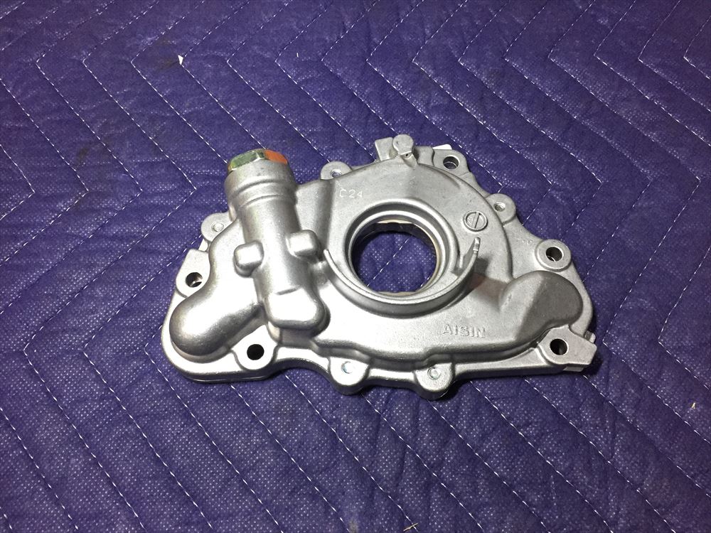 上の画像は新品のオイルポンプアッセンブリです。今回は純正のオイルポンプをそのまま取付するのではなく、強化タイプのローターを組み込むので、まずはオイルポンプを分解していきます。