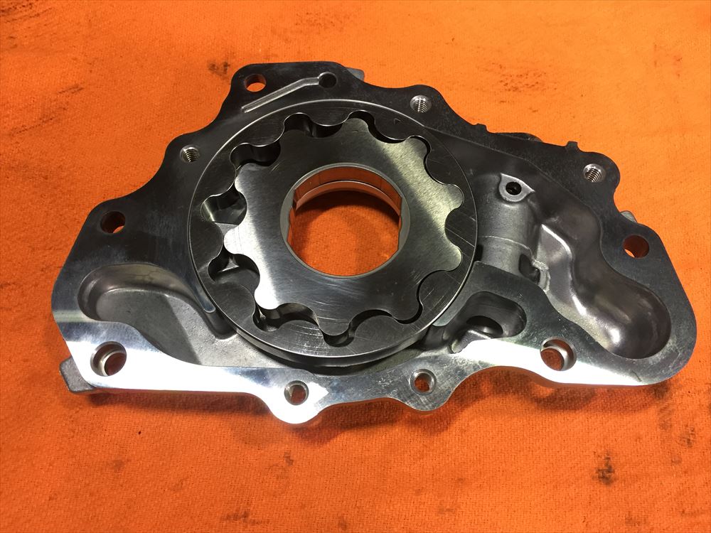 こちらが純正のオイルポンプの内部です。トロコイド式という一般的なポンプで、インナーのローター(ギア状のパーツ)がアウターのローターを回転させることにより、オイルパンからオイルを吸い上げると同時に、エンジン内に圧送します。仕組みはロータリーエンジンと少し似ていますね。