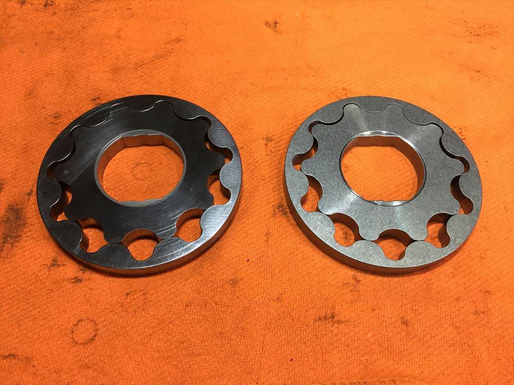 画像左側が今回組み付けていく強化タイプのローターです。形状はほぼ変わりませんが、純正と比べると色艶に少し差があるのがわかると思います。高回転時のクランクシャフトの振動で破損しないよう、素材を変更して強度が上がっています。