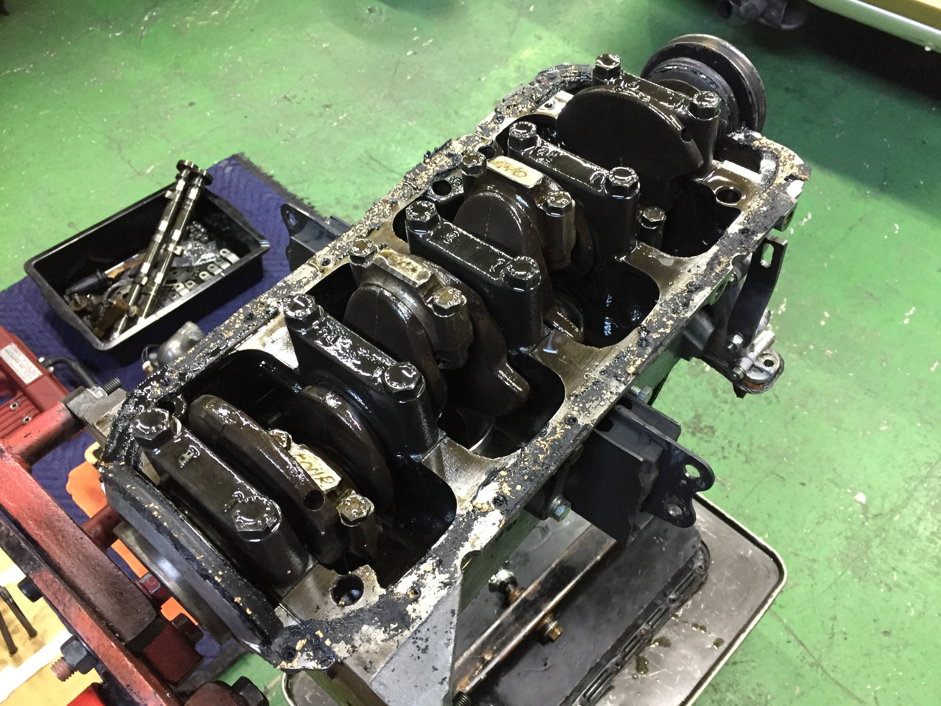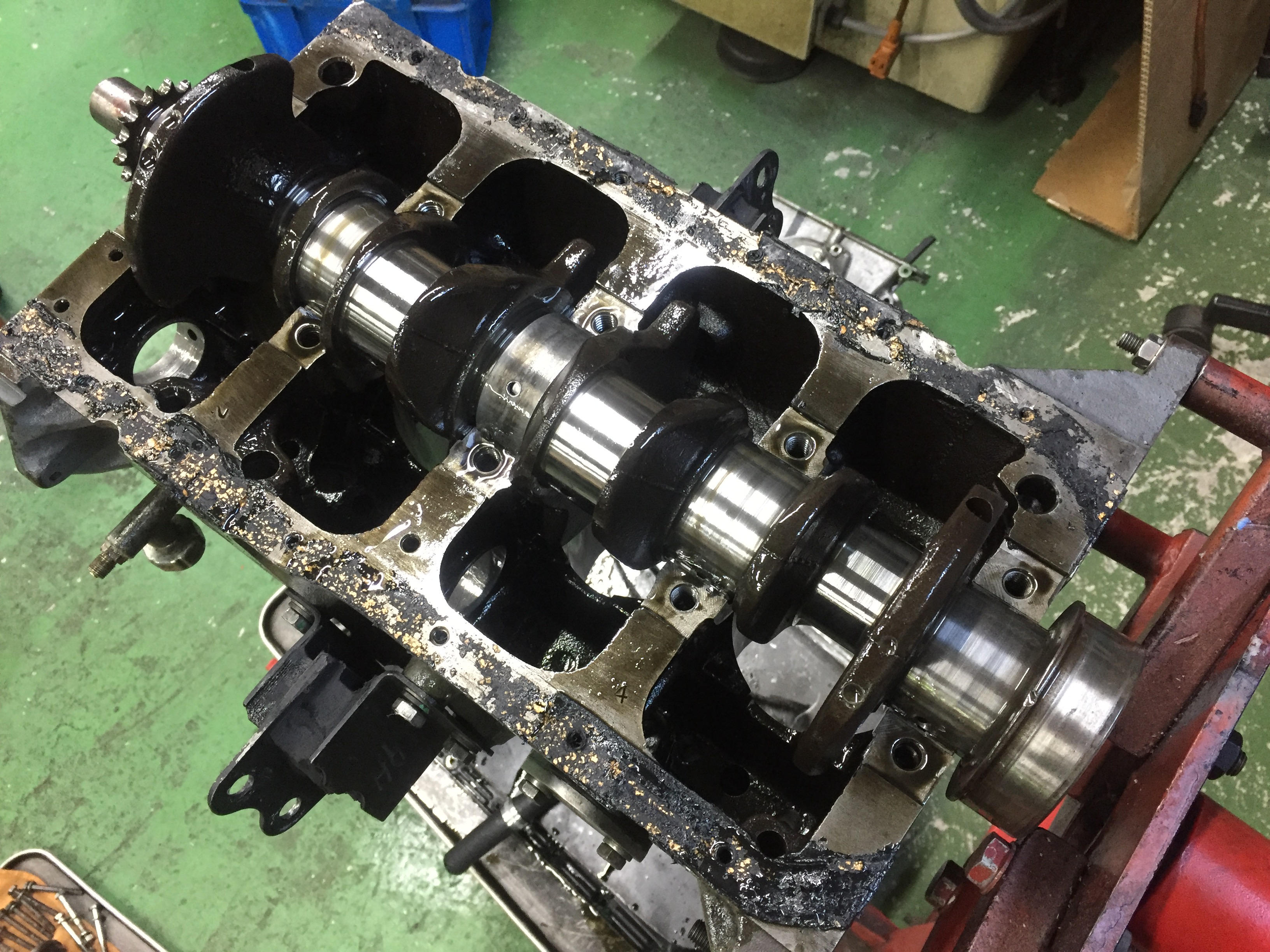 オイルパンを取り外してクランクシャフトの点検に入ります。