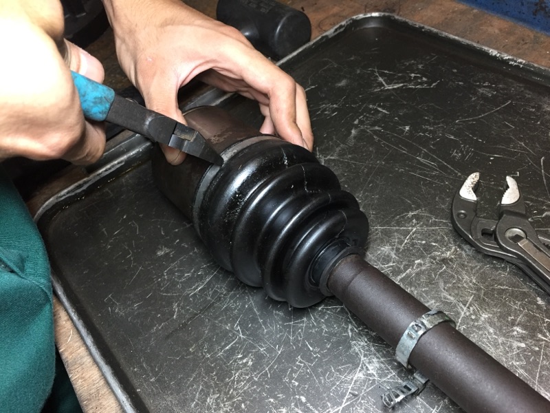 交換箇所は、右ドライブシャフトのインナー部分です。高温になるエキマニ中間パイプの真上にくるブーツですので、常に過酷な状態で使用されていることもあり、劣化は他のブーツに比べて早い傾向にあります。