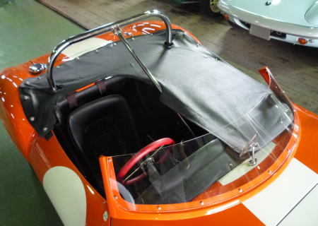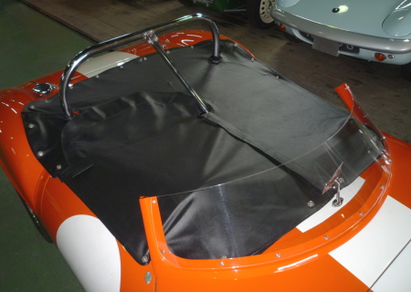 さらに今回のご入庫では、トノカバーの製作もご依頼頂きました。レーシング・スクリーンのスタイルですから、幌もハードトップも装着できません。このようにトノカバーを装着すれば、ちょっとした駐車時に重宝しますね。