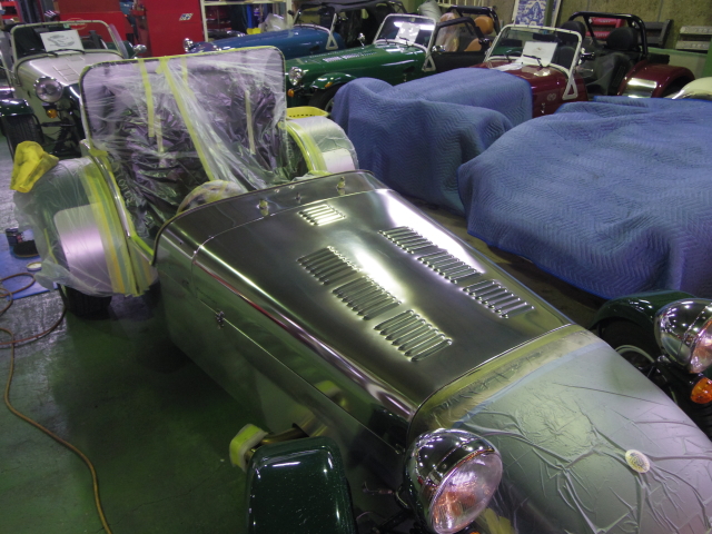 こちらはケータハムのアルミパネルのポリッシュ加工の最中です。最近はヘアライン仕上げのパネルをポリッシュに加工するお問い合わせが増えてきました。金属の光沢そのものを楽しめるのは、無塗装のセブンだけの特権です。この状態を維持するのはなかなか大変ですが、そこも含めてセブンライフの楽しさです!