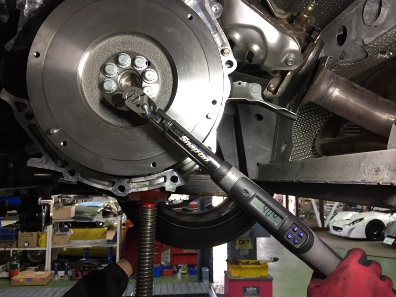 フライホイールはトルクをかけた後に角度締めをしますが、正確に締め付けるために最新の計測工具を使用します。もちろんボルトも全て新品です。