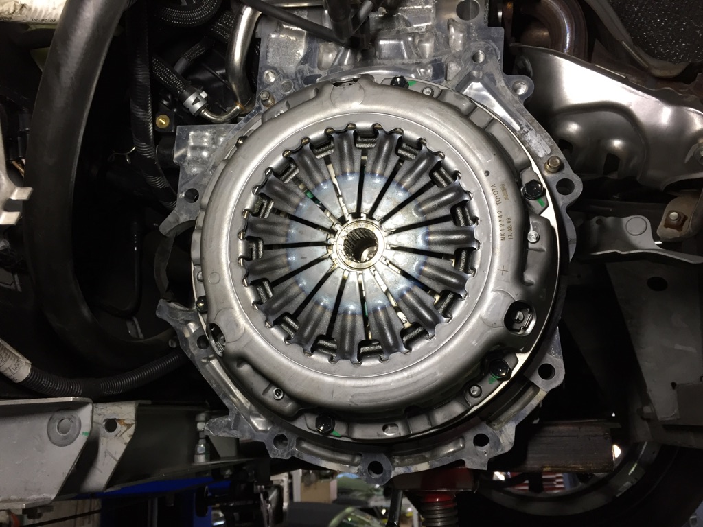 ギアボックスとベルハウジングを分離して、クラッチが露出しました。目視による点検だけではわかりませんので、クラッチディスクの残量を確認するために取り外します。