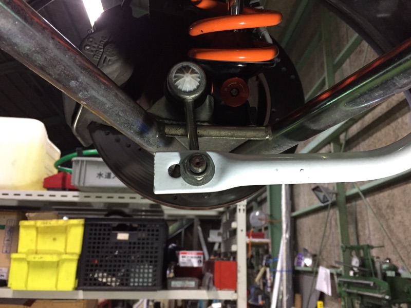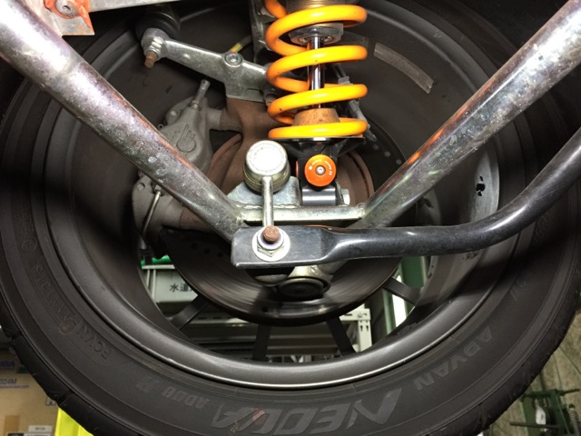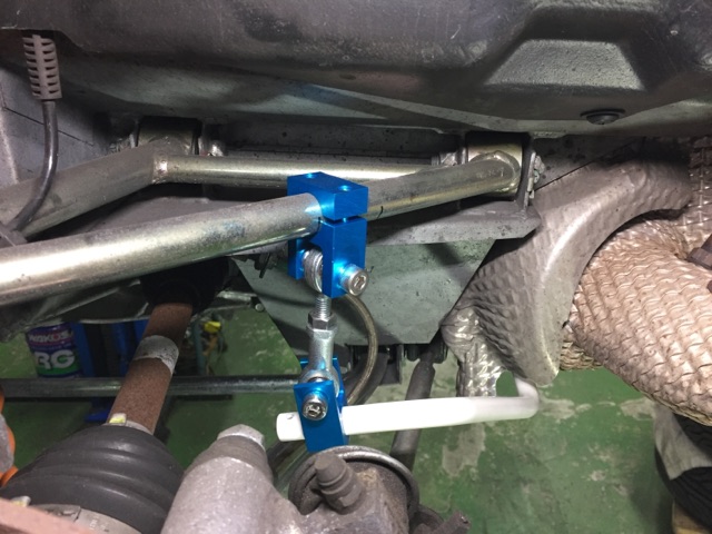 スタビライザーはリアのアッパーアームとリンクしており、画像の青いドロップリンクの位置で効きの強弱を調節することができます。
