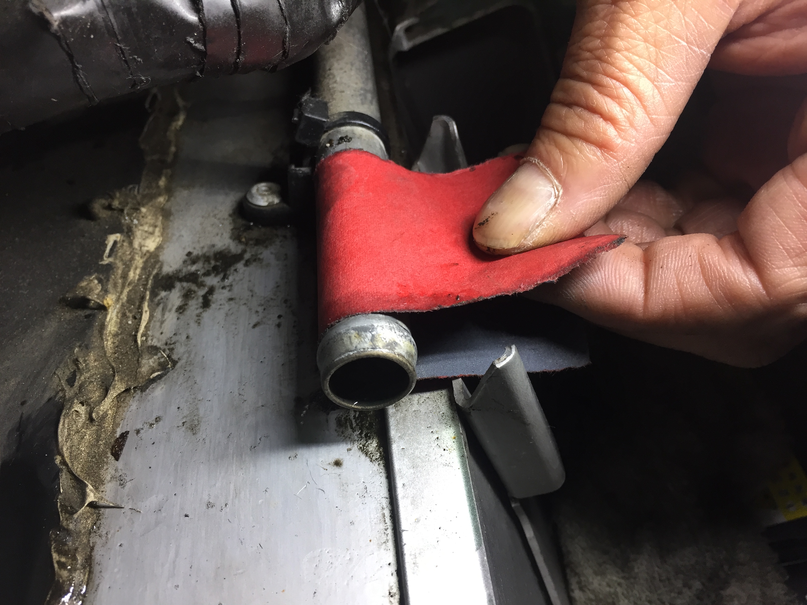 実際に作業を始めてみると、ホース交換の前に一手間必要な状況でした。既設のホースを外したところ、アルミパイプの接続部分の表面がかなり荒れており、このまま接続するとホースにダメージが及ぶ心配がありますので、サンドペーパーで研磨しました。