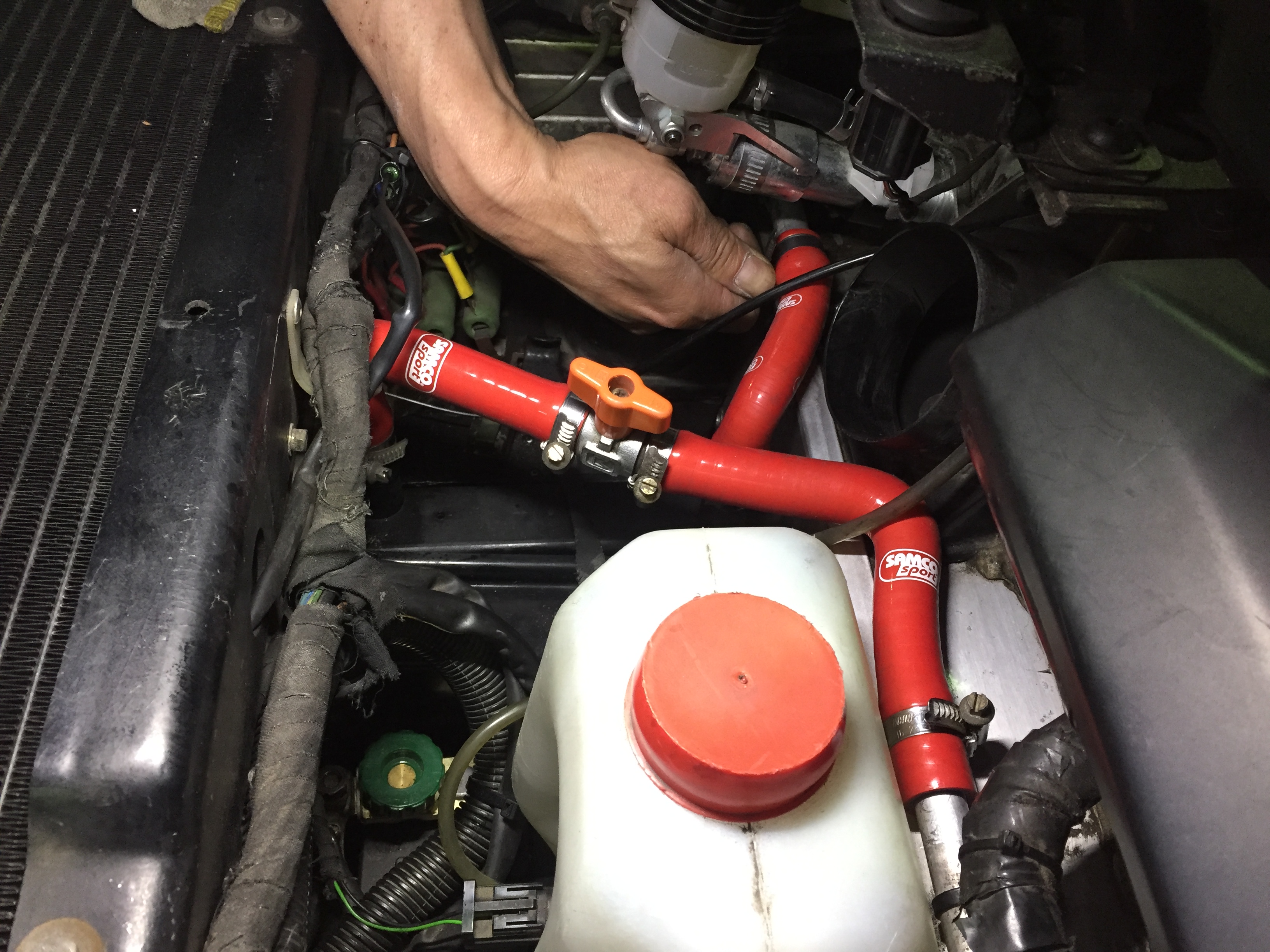 フロントセクションのヒーターホースもすべてシリコン製に交換しました。エリーゼMk1ではお馴染みのヒーターストップバルブもちゃんと移設してあります。