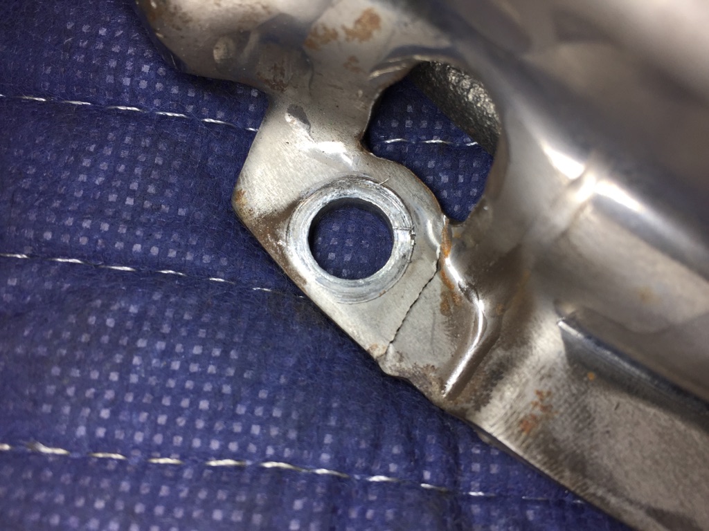 クラッチカバーを確認してみると、6本ある取り付けボルト穴のうち2箇所にクラックが入っていました。クラッチペダルに感じられた違和感の原因はこれだと思われます。やはりサーキット走行だけを繰り返してきた車両ですので、高い負荷による車体各部の疲労は無視できないレベルですね。定期的な点検の重要さをあらためて実感しました。