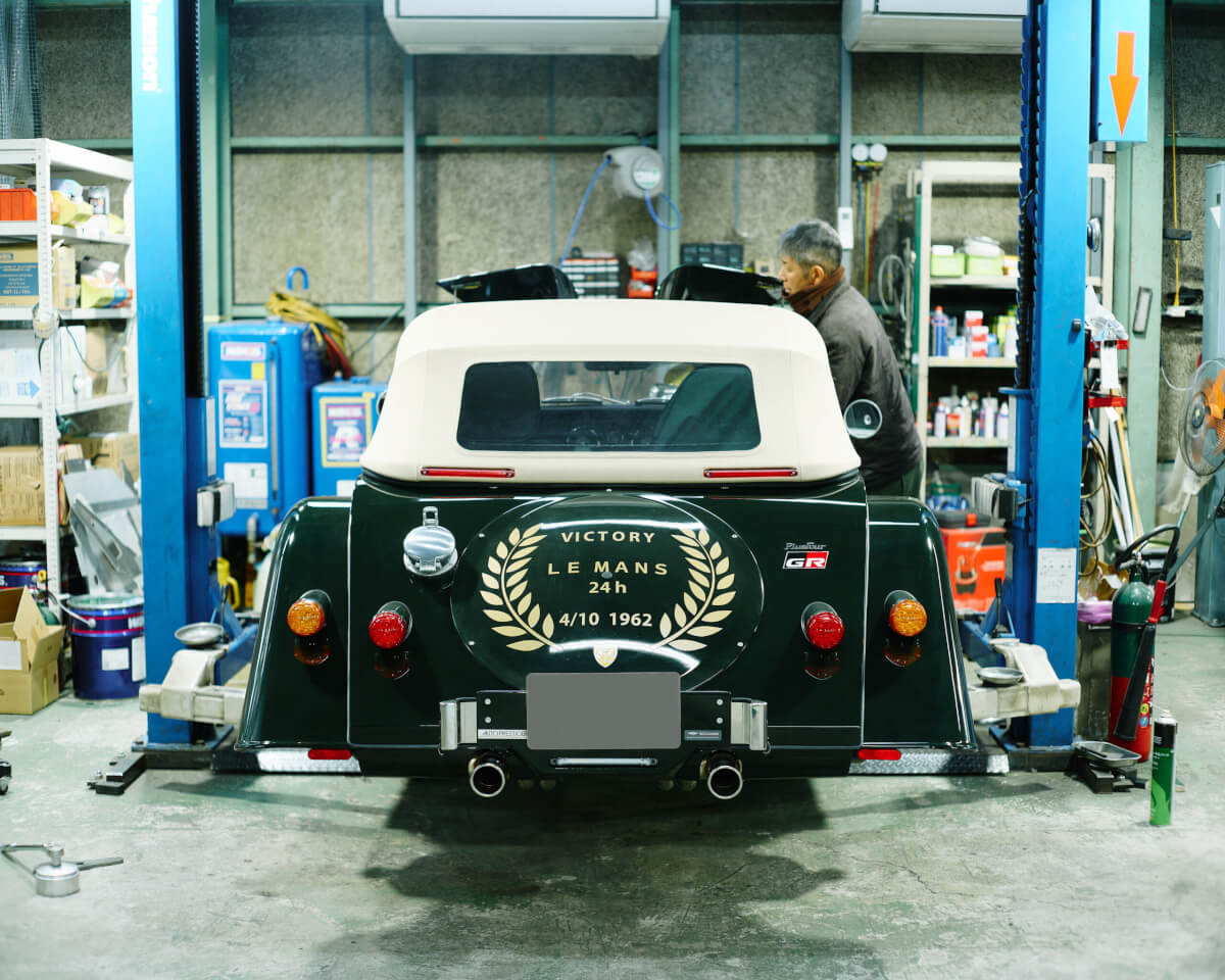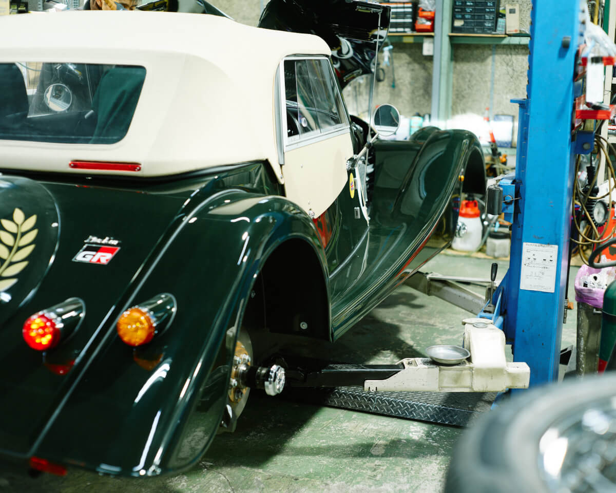 2023年式ブリティッシュ・グリーンのMorgan Plus Fourが、初回の車検整備で入庫いただきました。