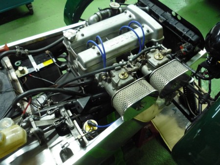 今日のウィザムカーズ・ファクトリーでは、かなり古い世代のケータハムの車検整備が進行中です。エンジンはLOTUS T/Cが搭載されています。もともとロータスから生まれたセブンですが、ロータス・ツインカムを搭載したセブンはあまり多くはなく、シリーズ4だけがロータス時代のツインカム・セブンでした。しかしケータハムに生産が移行した直後は、顧客からの強い要望でツインカムを搭載したセブンが生産されましたので、クラシック指向のセブン乗りには、この時代のセブンは非常に人気があります。