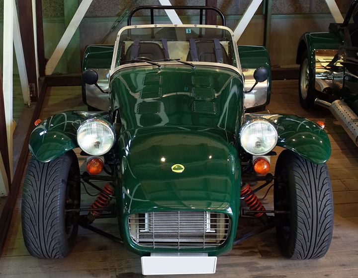 セブンといえばこの「クラムシェル・ウィング」を連想する方も多いと思います。日本ではプラモデルのロータスセブンがセブンの普及に一役買っていました。竹内も何度も組み立てましたが、ボックスアートに描かれていたのがグリーンのSr.2でした。