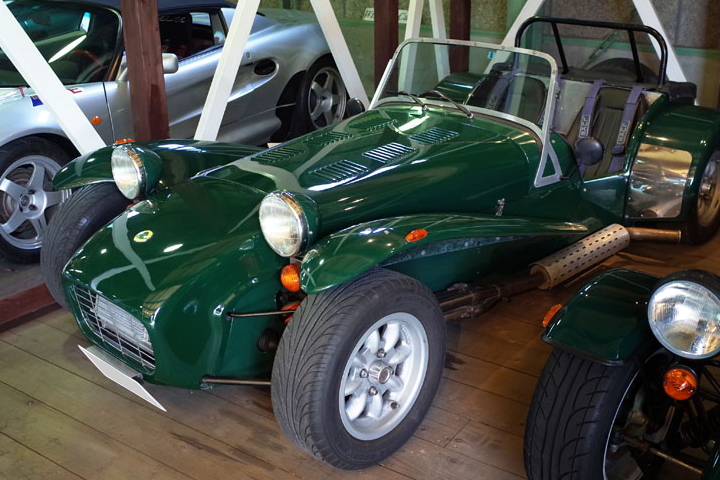 ほっそりとしたボディの両側に穏やかな傾斜で広がるフェンダーは、スーパーカーブームを自分なりに咀嚼し切った竹内少年の目には、とても優雅な乗り物に映りました。リアのスペアタイヤとスチールの細いロールバーも、この時期のセブンならではの風景ですね。