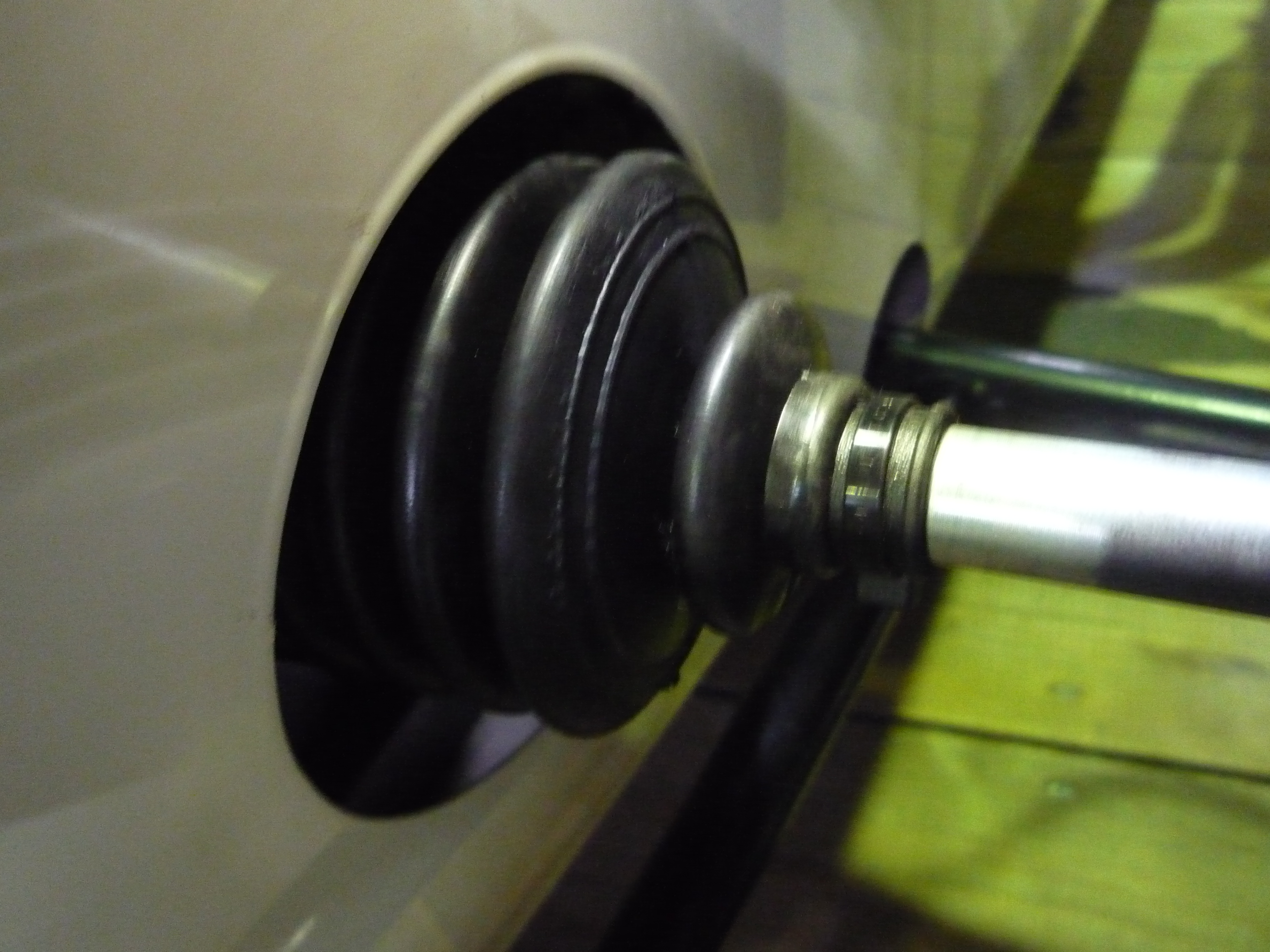 最近このブログに頻繁に登場している内藤メカニックが、リアの足回りを分解中です。ホイールを外し、ブレーキドラムを分解した後、写真のようにドライブシャフトを引き抜きます。