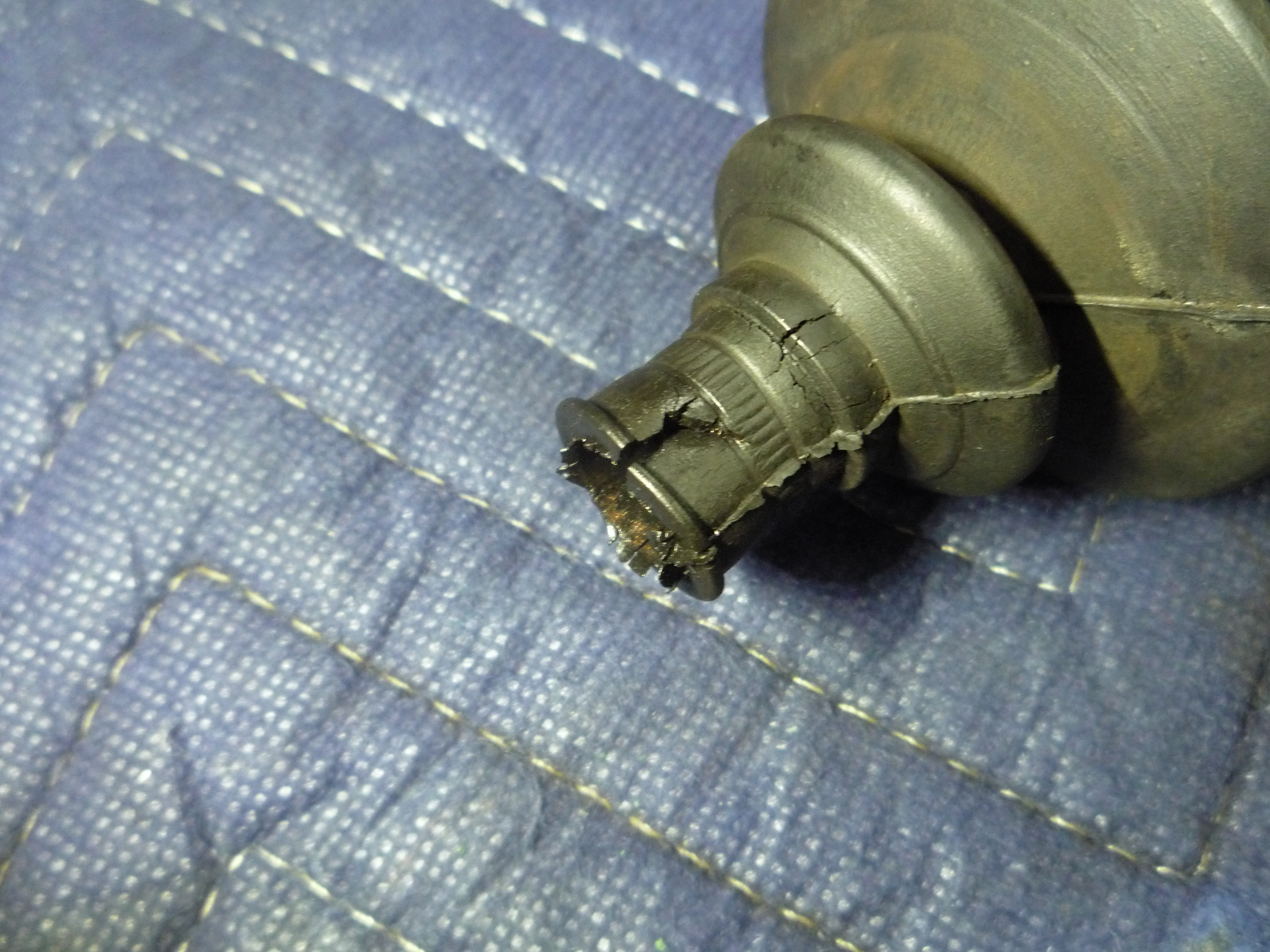 こちらも定番のステアリングラック両端に取り付けられているラックブーツです。こちらはステアリングラック内部へのゴミの侵入を防ぐパーツですが、ステアリング操作を行う度に伸び縮みしており、さらには直射日光にも常にさらされる部分です。そのため比較的劣化もしやすく、劣化が進行すると写真の様に破れてしまいます。こうなってしまうと砂やゴミが侵入してしまうばかりか、車検にも通らなくなってしまいますので今回はこちらも新品に交換しました!