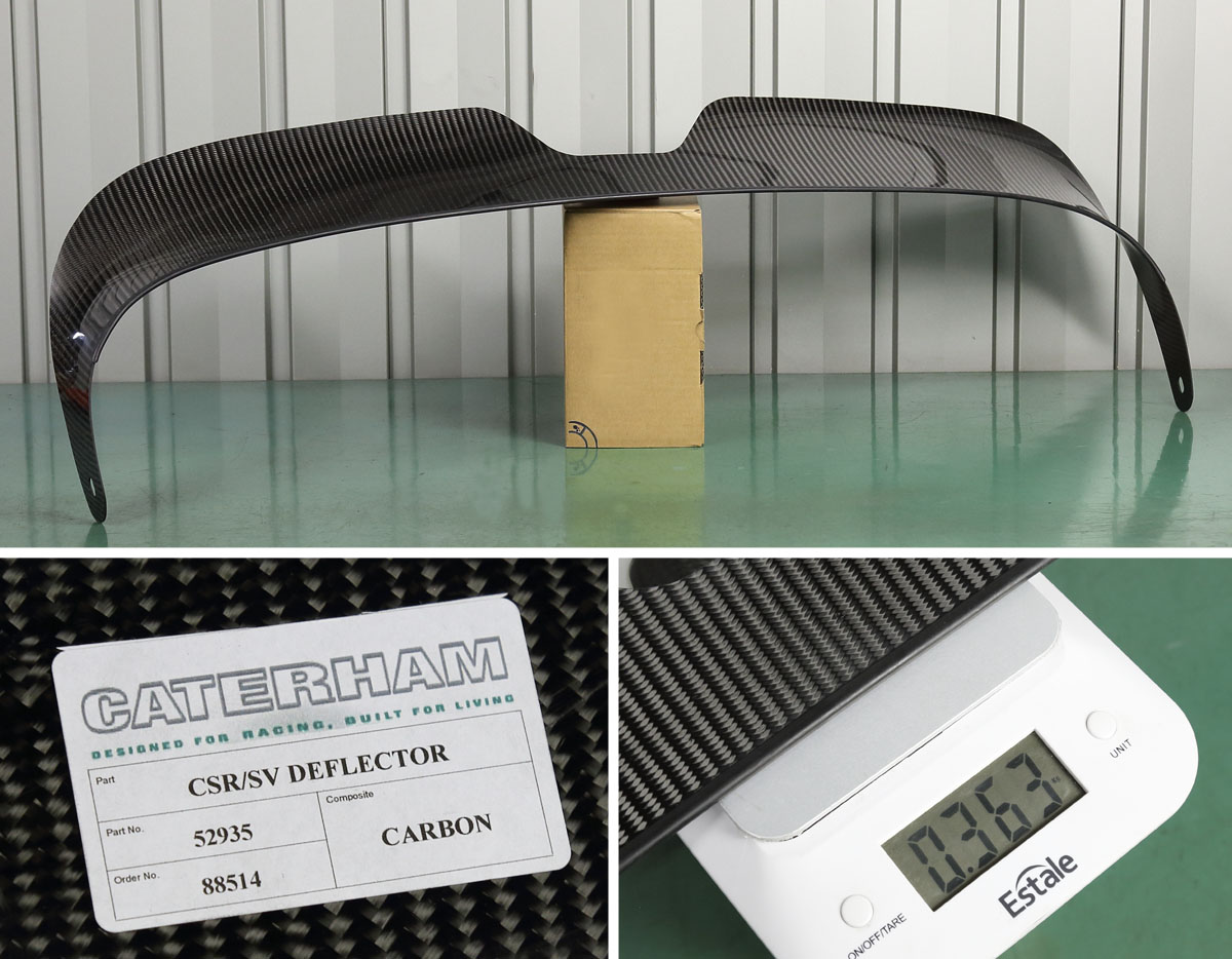 ケータハム純正のカーボンレーシングスクリーンのご紹介です。CSRとシリーズ5 シャシー専用のスクリーンは貴重ですよ。重さを想像しながら手に持ってみると驚くほどの軽さ。実際に量ってみたら、わずか360gしかありませんでした。ガラスのウィンドスクリーンと比べると大幅な軽量化となります。軽さを突き詰めたい、または愛車をレーシーなスタイルに仕上げたいオーナーの方、いかがですか?