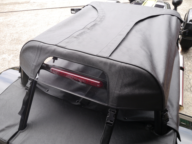 通称ビキニトップと呼ばれる簡易ソフトトップは従来から色々なものが登場しましたが、やはり純正部品 は細部までよく考えられており、一味違います。ボディとの固定はファスナーではなく太いベルトを使用していますので、高速道路での走行も問題ありません。ベルトの途中にはワンタッチのバックルがありますので、脱着がとても簡単です。後ろ側の一部は透明になっていますので、ハイマウント・ストップランプの視認性もよく安全です。