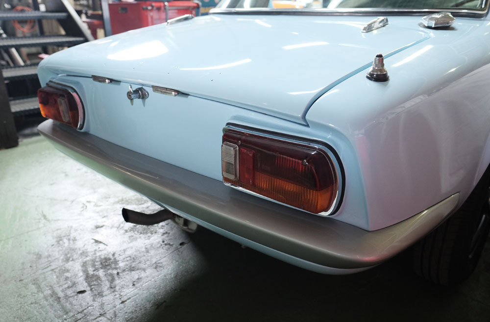 リアバンパーは新品を装着しました。ヒストリックカーのパーツはオリジナルが生産終了であっても、リプロ品が新品で手に入ります。しかし同じ型で長い間生産されているパーツですから、すんなり装着出来ることは稀です。