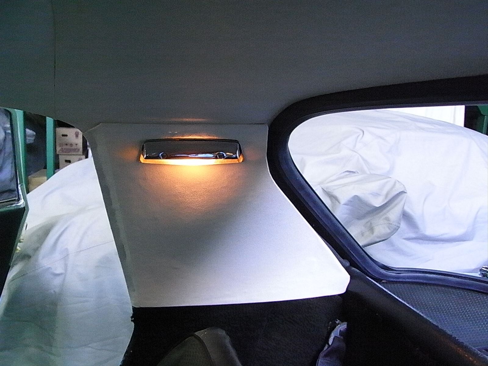 Bピラーの内装を貼り付け、インテリアのリフレッシュはほぼ終わり、インテリアランプが灯りました。車の世界も省エネなLEDがどんどん普及していますが、電球の優しい色合いの光はやっぱりホッとします。