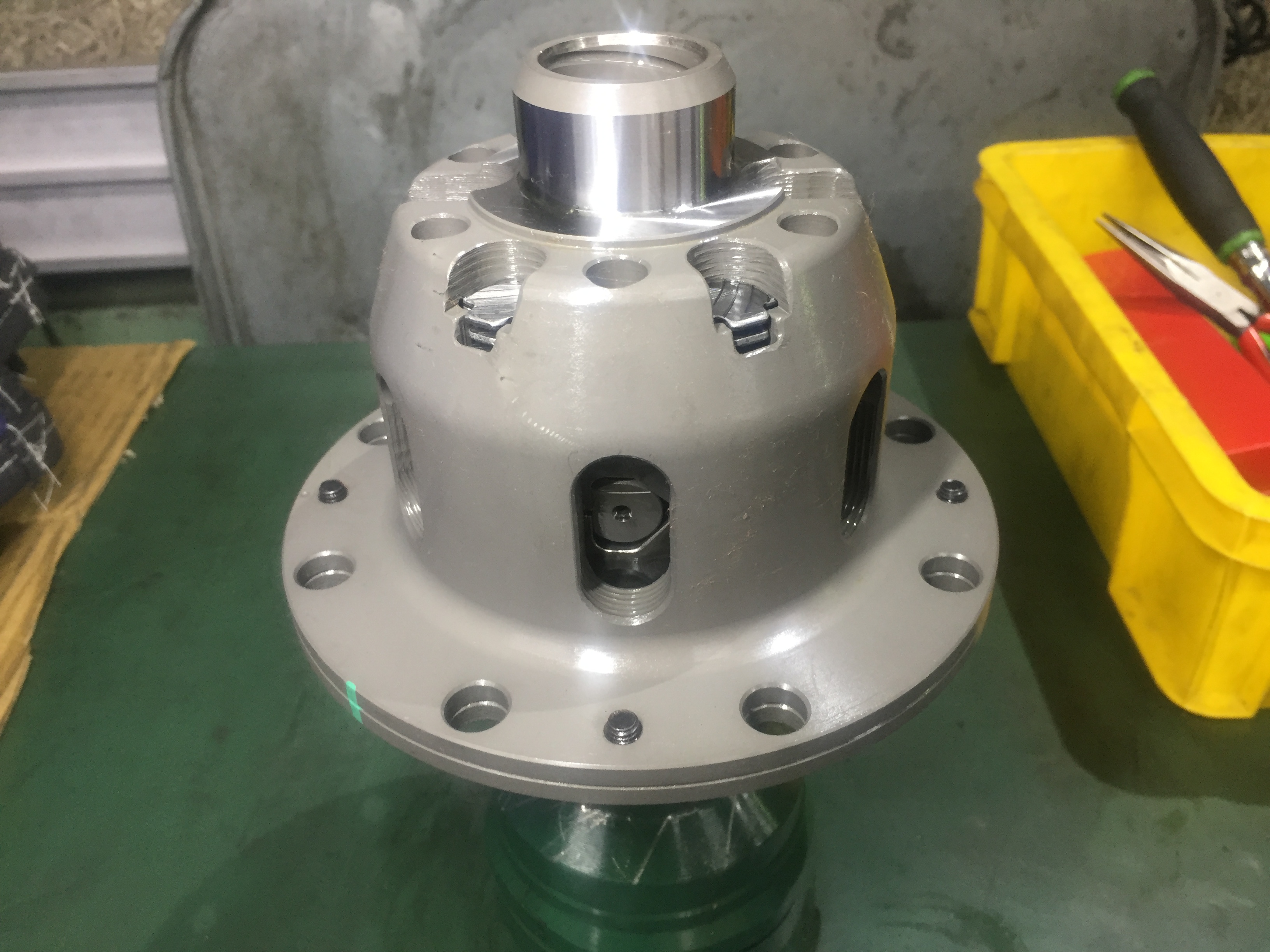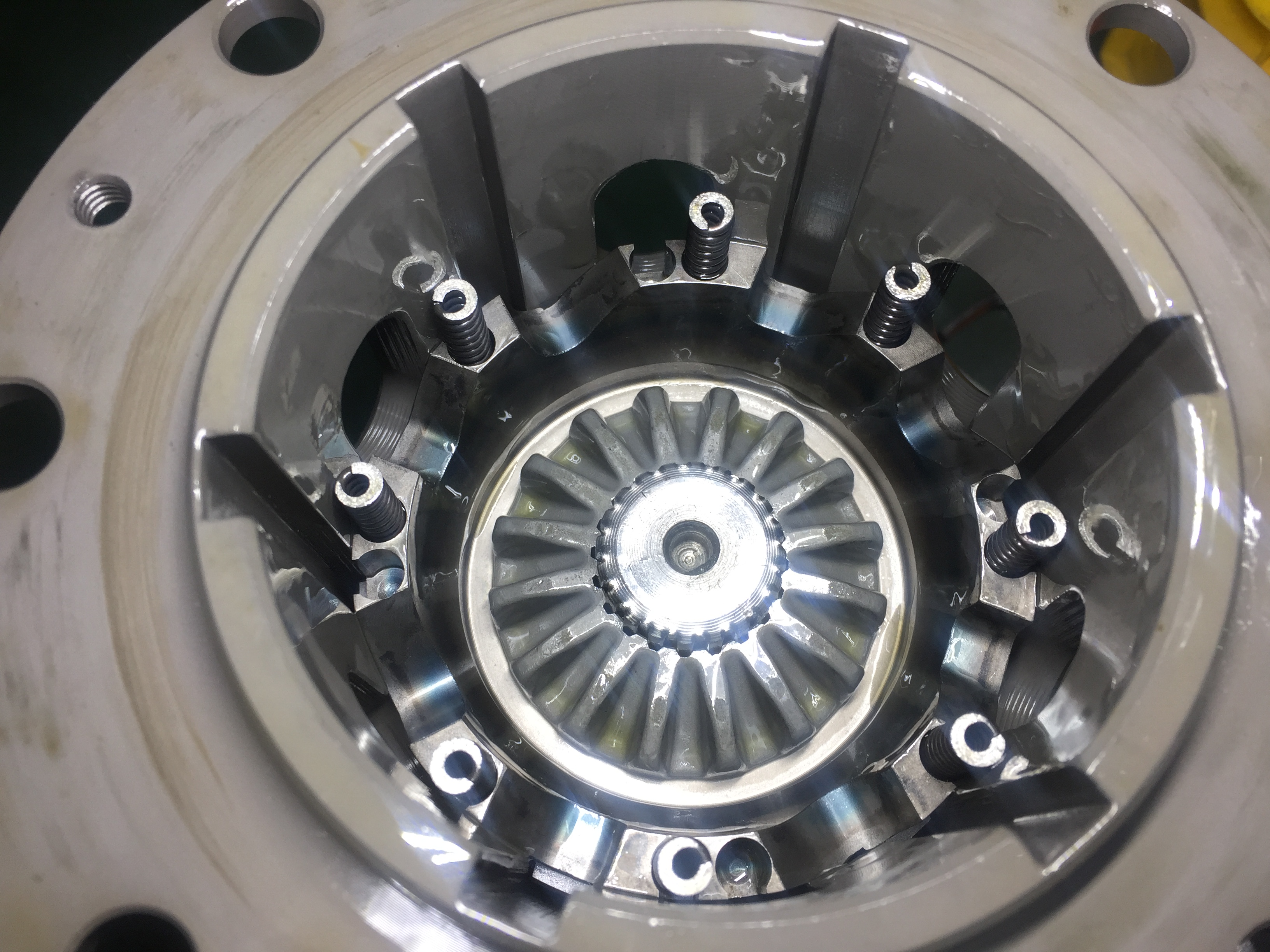 写真の外周に写っている小さなスプリングが、こちらのLSDの特長でもあるイニシャルトルクを発生させるパーツです。スプリングの本数によってイニシャルトルクが変化していきます。今回はお客様の要望に応じて、設定を1wayにして、イニシャルトルクも調整させていただきました。