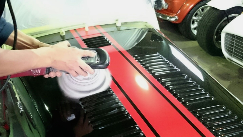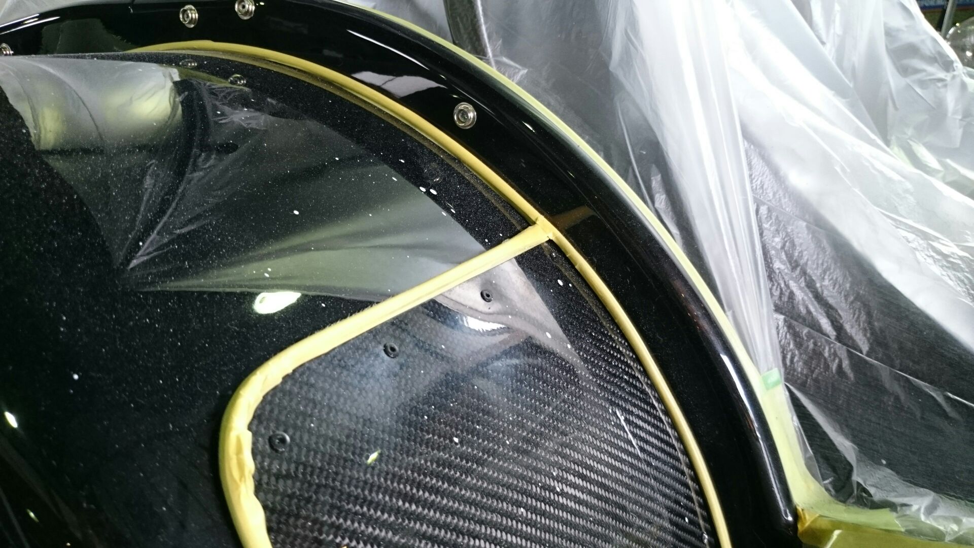 磨き&コーティング作業まで全て終了いたしました!ブラックの様な濃い色は磨き上げると本当に美しいですね。ブラックオールペイントのボディとカーボンフェンダー、そしてアクセントのレッドストライプ、、、カッコイイ!!!の一言です。