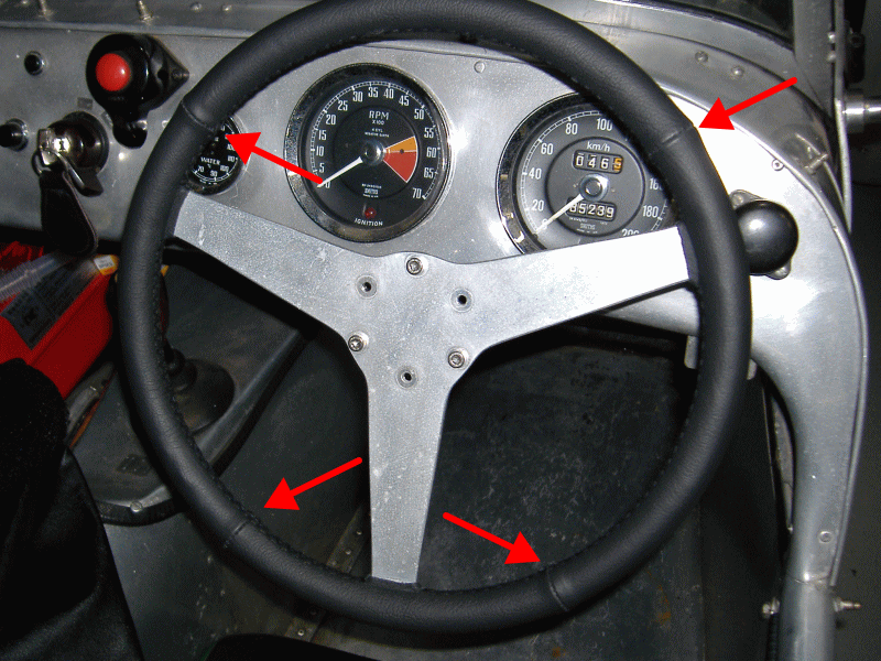 こちらは弊社スタッフの竹内の愛車「ロータスセブンSr.1」のステアリングホイールです(^^)。写真の矢印の部分にご注目いただくと、革張りのステアリングのつなぎ目部分が見えますね。