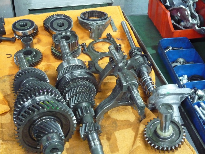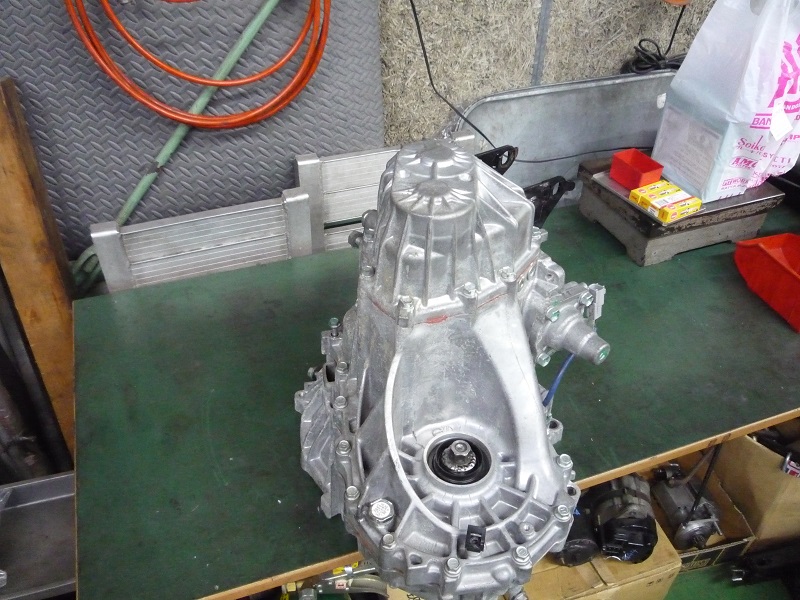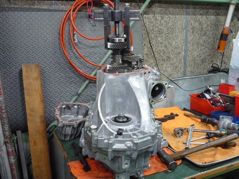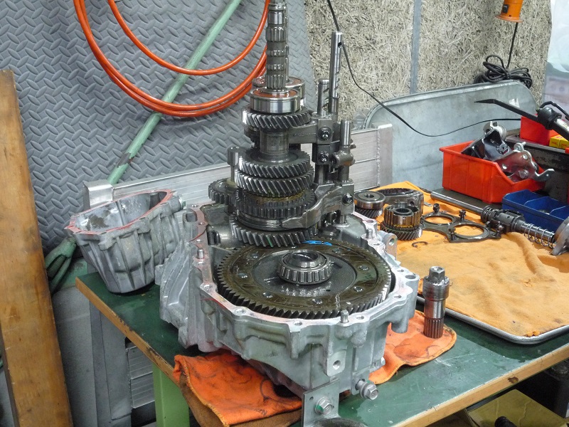 まずは車輌からギアボックスを降ろしている写真です。この作業の前に、アンダーパネル、サスアーム、ドライブシャフトなどを既に取り外しております。もちろんミッションオイルも抜いておきます。