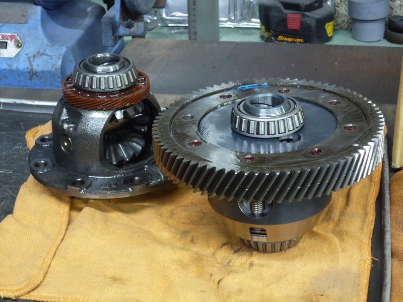 LSDにリングギヤを取り付けた物と外したノーマルデファレンシャルです。ここまで来れば、逆の手順で組み付けるだけです。言葉で言うと一言ですけど、外すより組み付けのほうが大変なんですけどね(笑)