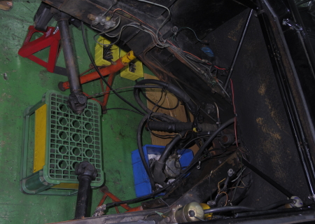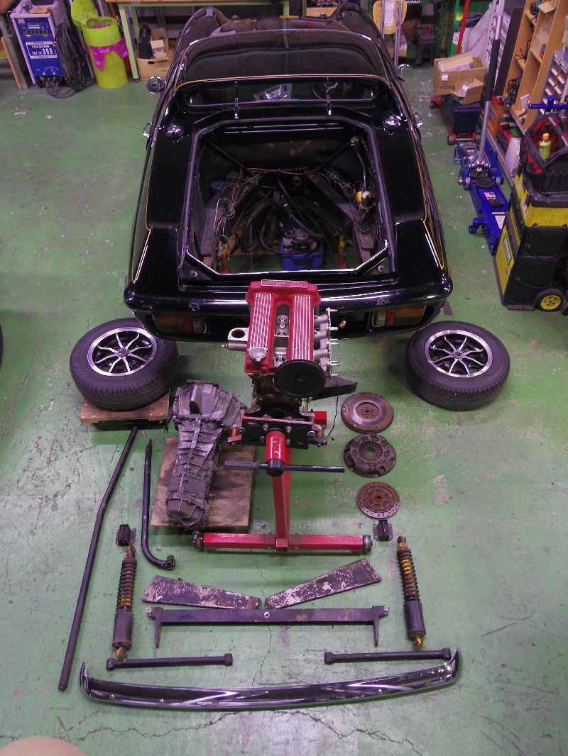 現在ウィザムカーズ・ファクトリーでは、ロータス・ヨーロッパSPの納車整備が進行中です。ご覧の様にエンジン、ギアボックス、サスペンションなど全てを分解し点検を実施していますので、エンジンルームは完全にがらんどうの状態です。もはやフルレストアと呼んでも良いくらいの徹底的な分解ですが、弊社ではあくまでも納車整備の一環として実施しています。