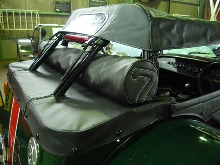 さらに【7】の文字が縫い込まれた長~い物は、HOOD BAGです。幌を外した時に通常は畳んでトランクに入れておくのですが、貴重なセブンの積載スペースを占領してしまいます。このHOOD BAGを使うとかなりコンパクトに幌を収納することができます。トランクのスペースも確保することができますよね ♪