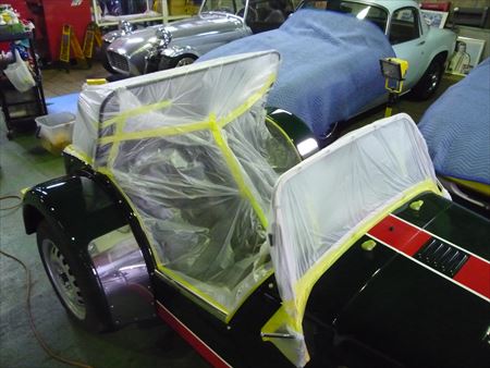 毎回毎回、磨きに入る前の徹底されたマスキングにはプロのコダワリを感じます。同じSEVEN でも今回の車両はボディラインが入っているので、そこも気を使うポイント。1台1台微妙にやり方が変わってきます。