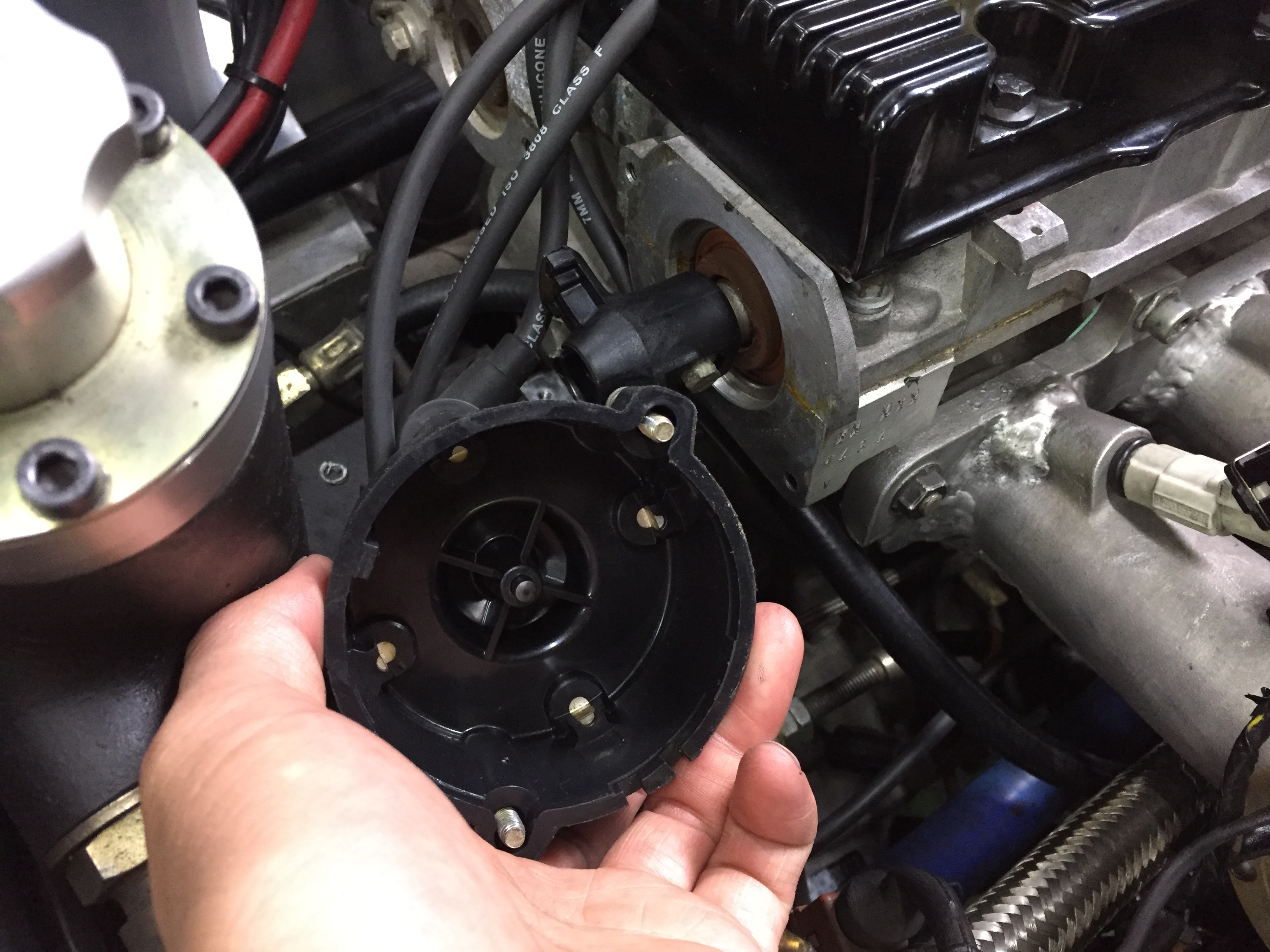 ベルハウジングと一体化したオイルタンクの直前にディストリビューターが設置されていますので、上部の筒になっている部分を一緒に取り外して点検を行います。ディストリービューターキャップ、ローター、プラグコード、プラグなども点検し、異常がないか確認します。
