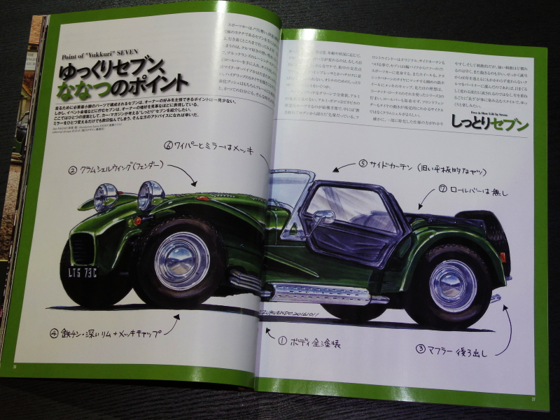 「ゆっくりセブンななつのポイント」というページでは、クラムシェルフェンダーのクラシックなセブン像が描かれていますが、近日納車予定のセブンがまさにこの仕様で、お客様もびっくりしていました。今のセブンのニーズを的確にキャッチしてカタチにしているのがさすがですね。