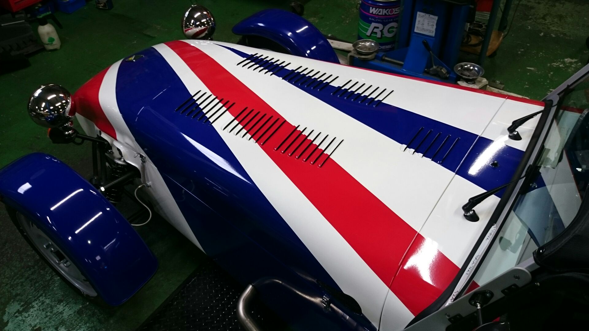 いかがでしょうか、今回はお客様のご要望により、セブン160をベースとしてこのカラーリングを重ねてみました。イギリス国旗をモチーフとしたデザインと配色で、一見とても派手に見えますが、他にはない独創的なカラーリングでついつい近寄って見入ってしまいます(^^;)