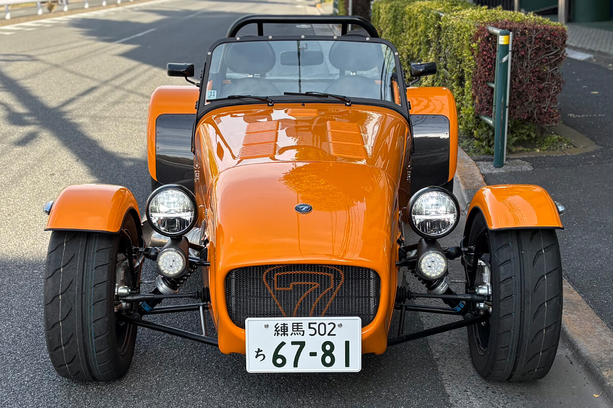 クラシカルなヴィンテージグリーンとアルミボディの組み合わせは、ケーターハムの王道スタイル。オプションのLEDヘッドライトが、さりげなくモダンな印象を与えています。
