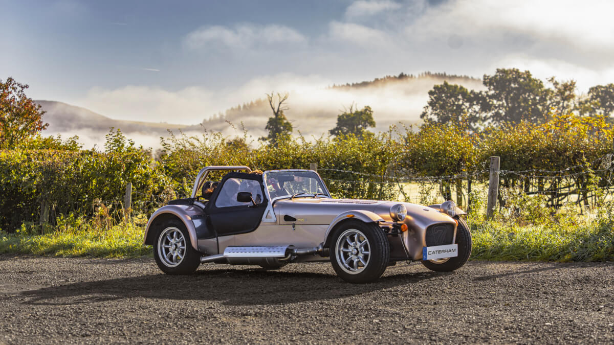 クラシカルなヴィンテージグリーンとアルミボディの組み合わせは、ケーターハムの王道スタイル。オプションのLEDヘッドライトが、さりげなくモダンな印象を与えています。
