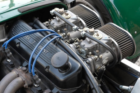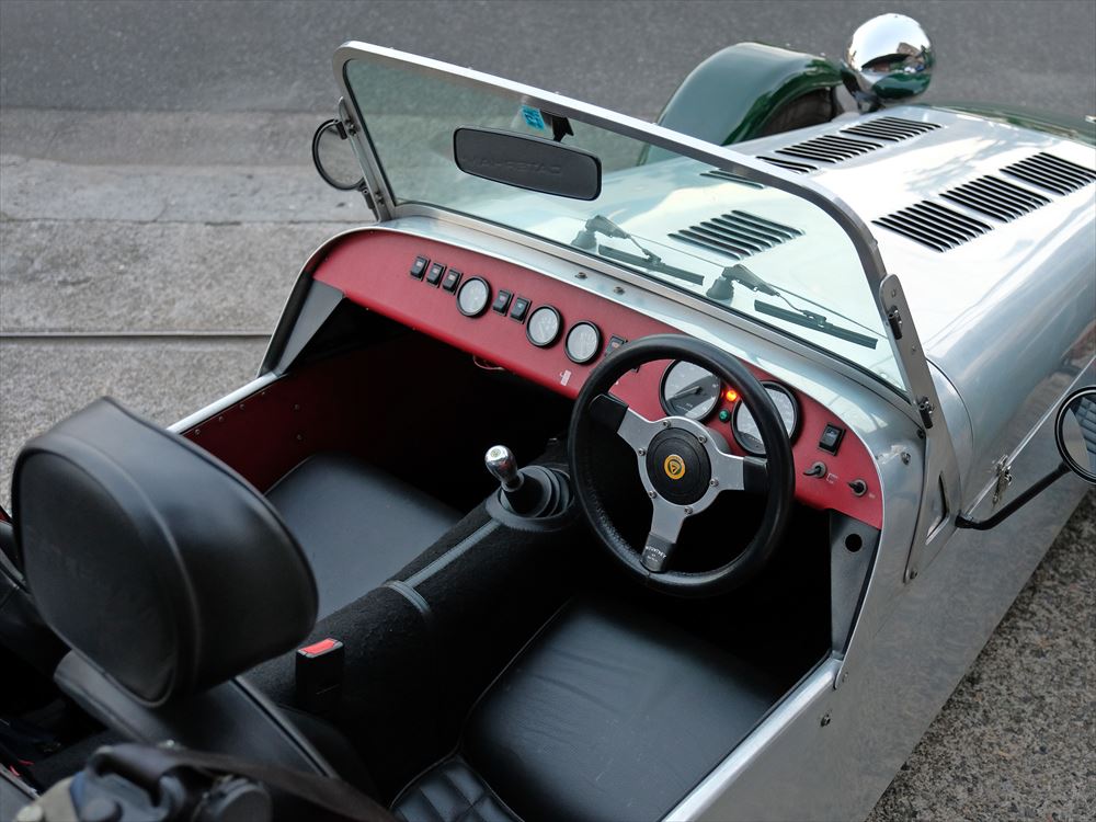 ウェーバーを2基搭載したエンジンは約100馬力。500kg台の車重には十二分なパワーであり、キャブの豪快な吸気音とダイレクトなレスポンスを堪能するには最適なモデルと言えるでしょう。ウィンドスクリーン・幌・サイドドア・レザーシート・スペアタイヤキャリアを全て装備しているのも嬉しいポイントです。