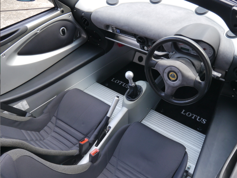 エアバッグが標準化される直前の仕様ですから、メーターカウルやステアリングも96年デビューのエリーゼMk1世代と共通のデザインで、ロータス特有の潔いシンプルさが清々しいですね。