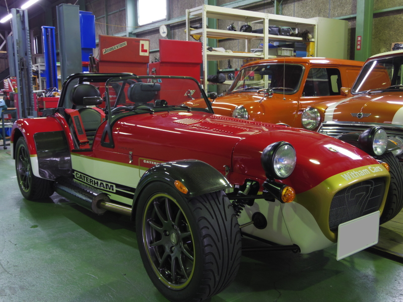 点検整備中の620Rの隣りでは、クラムシェルフェンダーのセブンの整備が進んでおります。クラシックな印象をより強調するために、ロールバーのないプレーンなトランクに仕様変更中です。さらに、もうすぐSEVEN160のLSD組込作業も始まります。こんなにSEVENの整備が集中している工場はイギリスにもないのでは?というくらいセブン密度が上がっております。これからセブンをご検討の御客様も、ぜひ一度ケータハムさいたま・ウィザムカーズファクトリーにお立ち寄り下さい。セブンの全てが一度にわかりますよ!
